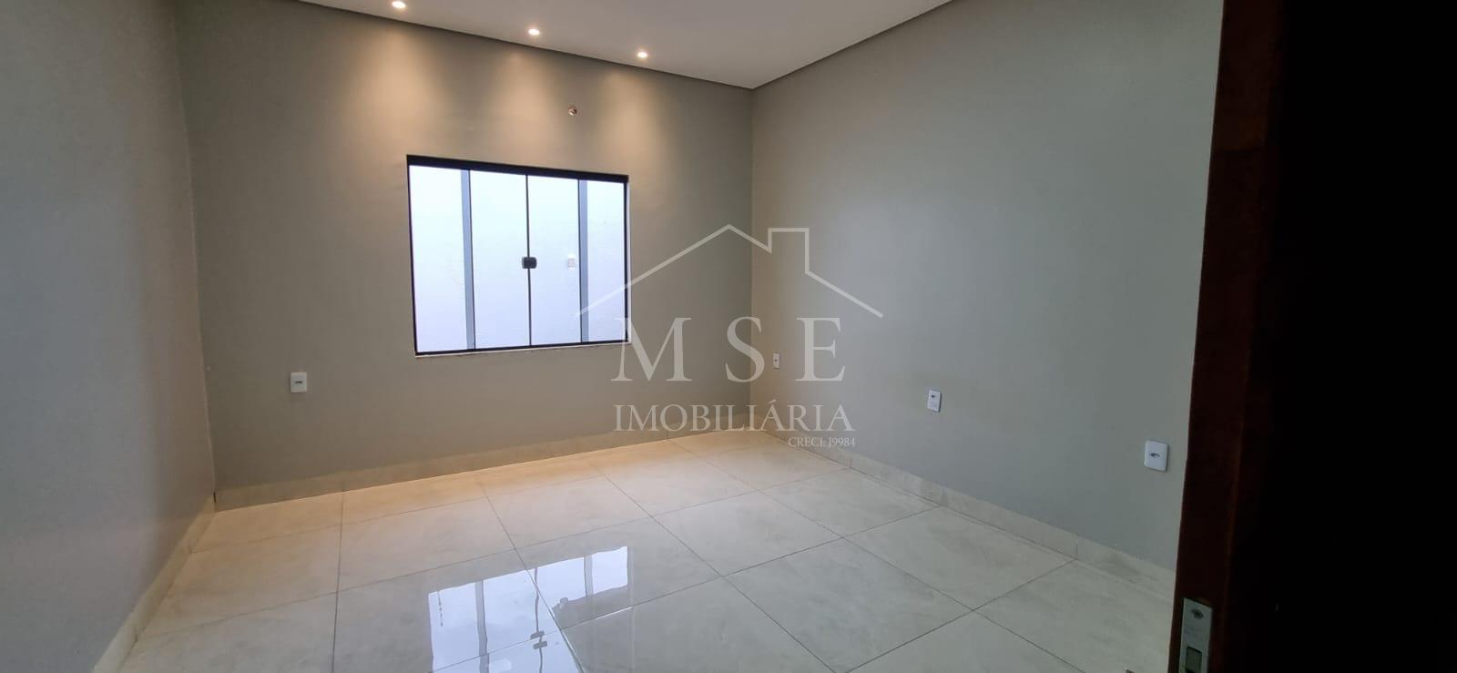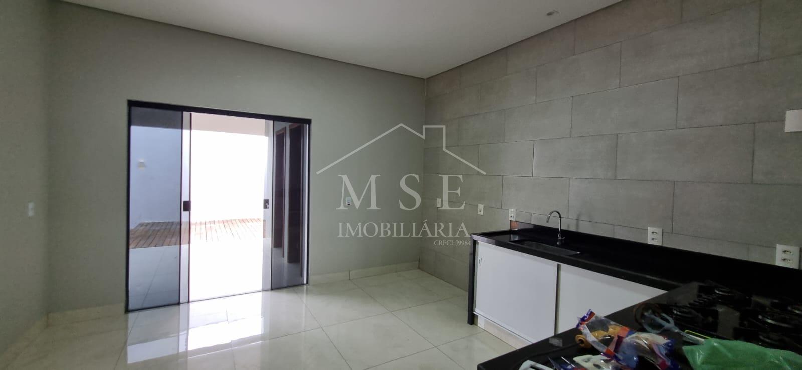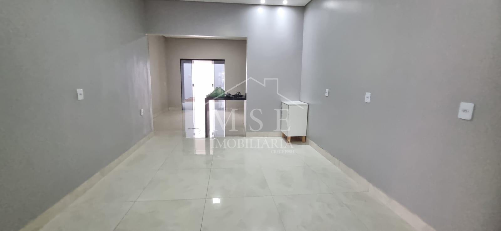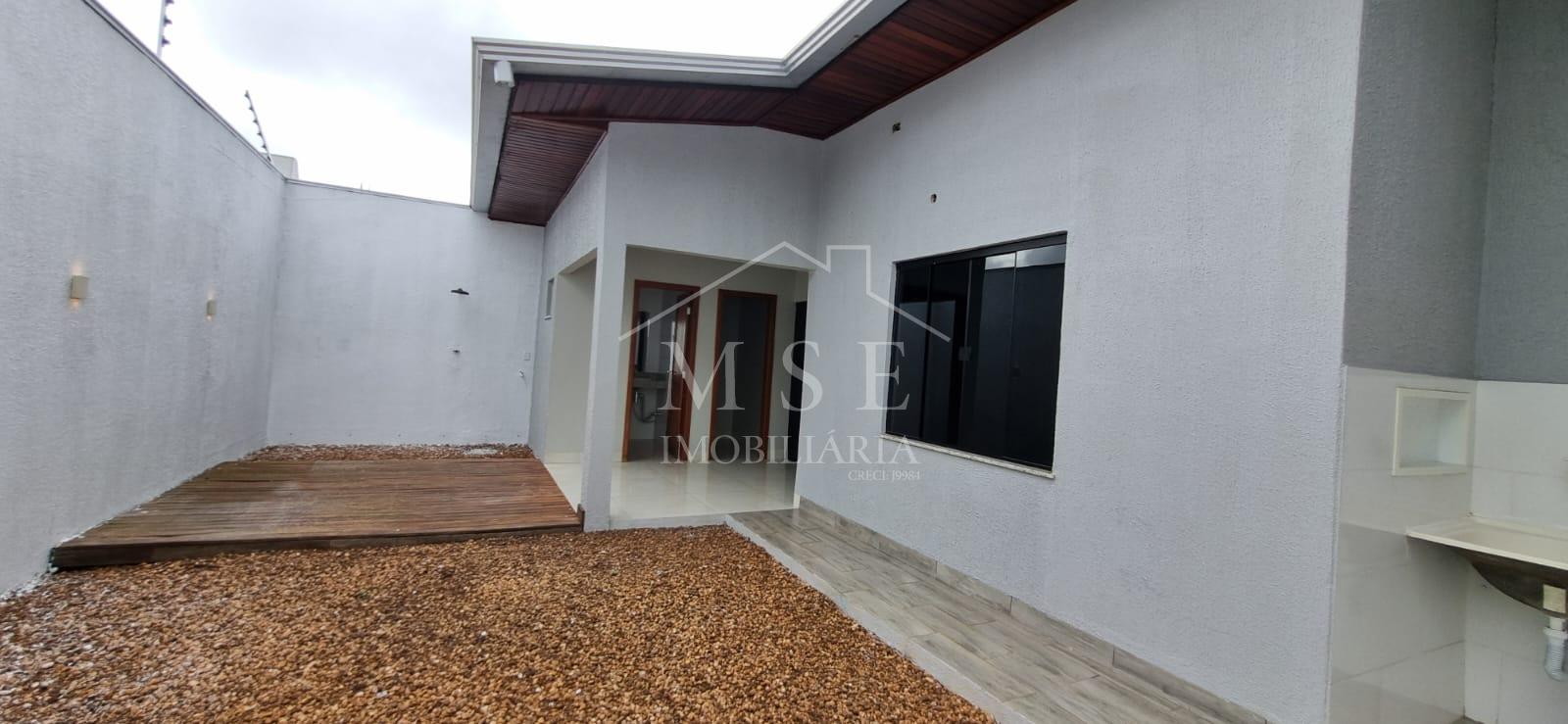 Um imóvel residencial, com 3 quartos, banheiro social, sala integrada à cozinha americana, dispensa, banheiro externo, área nos fundos, lavanderia coberta, área na frente com churrasqueira, garagem coberta para 2 carros, quintal, cerca elétrica e portão eletrônico.