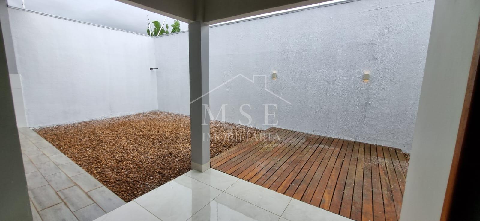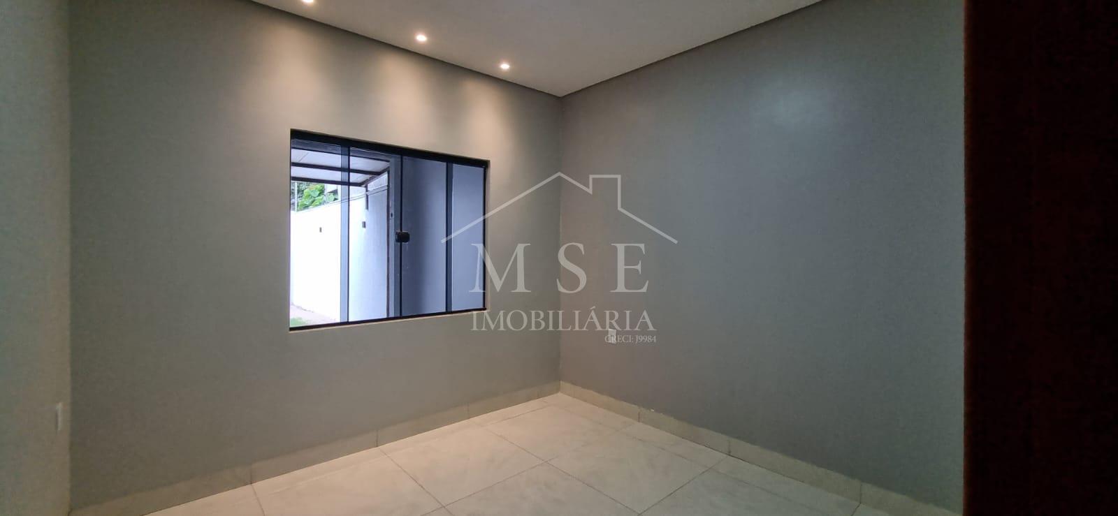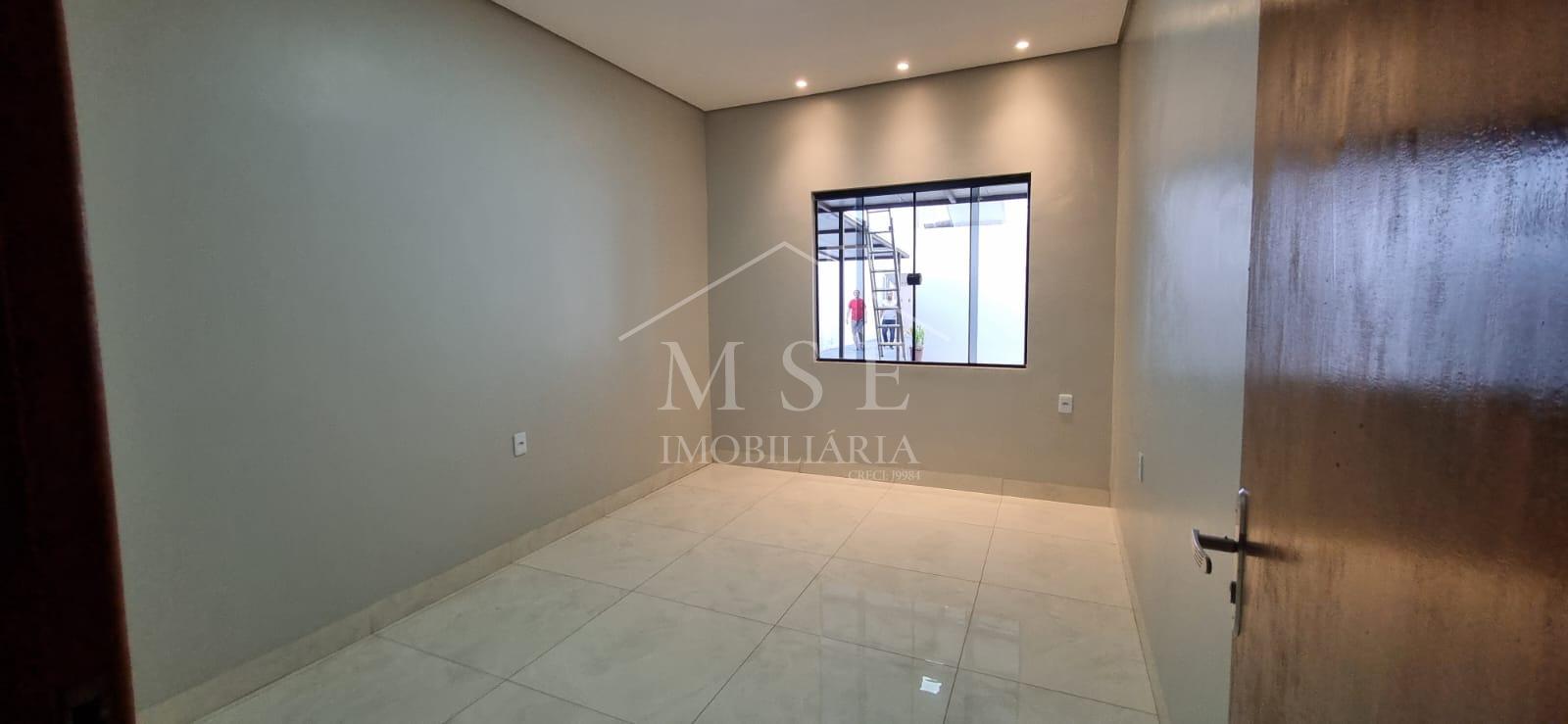 Um imóvel residencial, com 3 quartos, banheiro social, sala integrada à cozinha americana, dispensa, banheiro externo, área nos fundos, lavanderia coberta, área na frente com churrasqueira, garagem coberta para 2 carros, quintal, cerca elétrica e portão eletrônico.