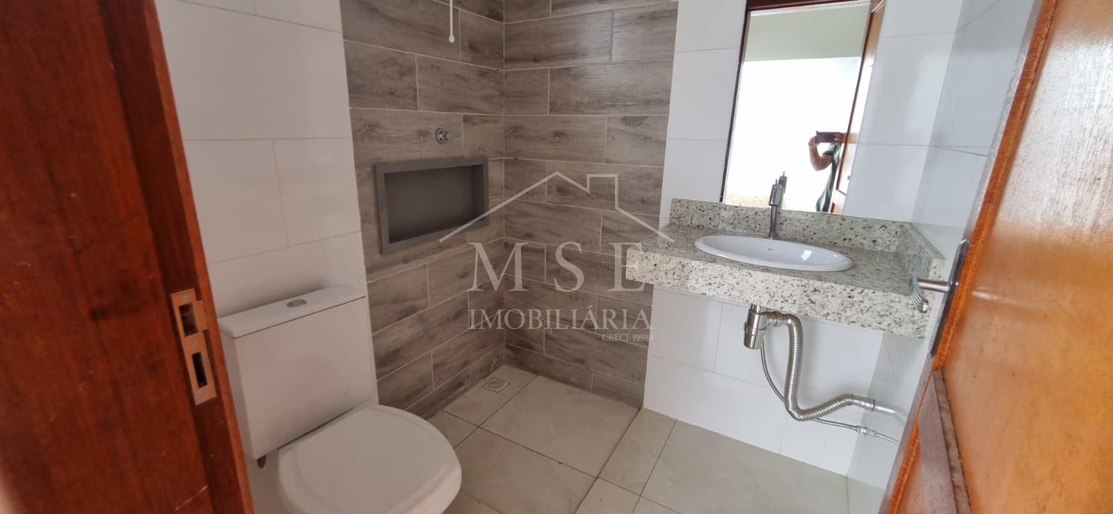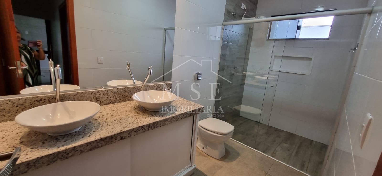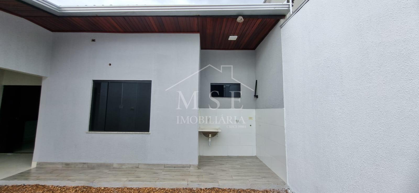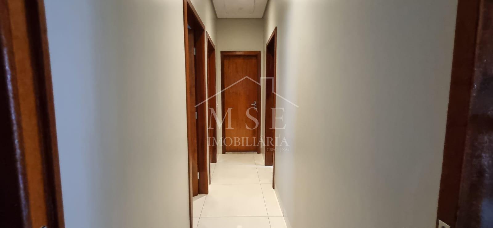 Um imóvel residencial, com 3 quartos, banheiro social, sala integrada à cozinha americana, dispensa, banheiro externo, área nos fundos, lavanderia coberta, área na frente com churrasqueira, garagem coberta para 2 carros, quintal, cerca elétrica e portão eletrônico.