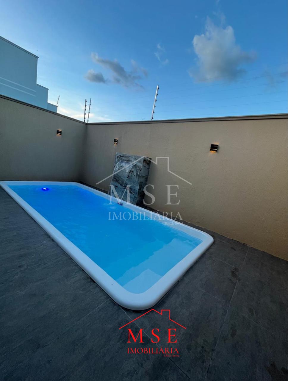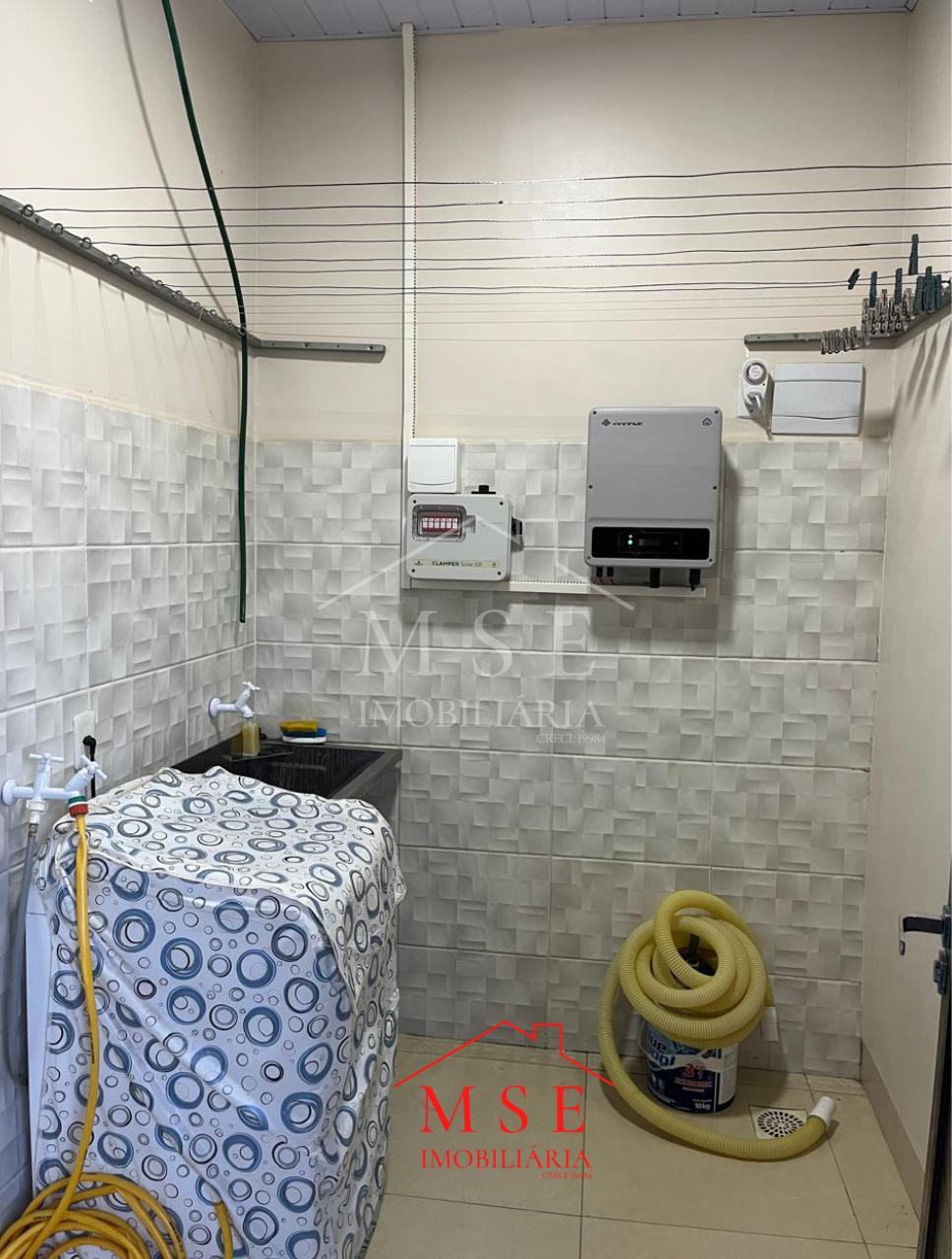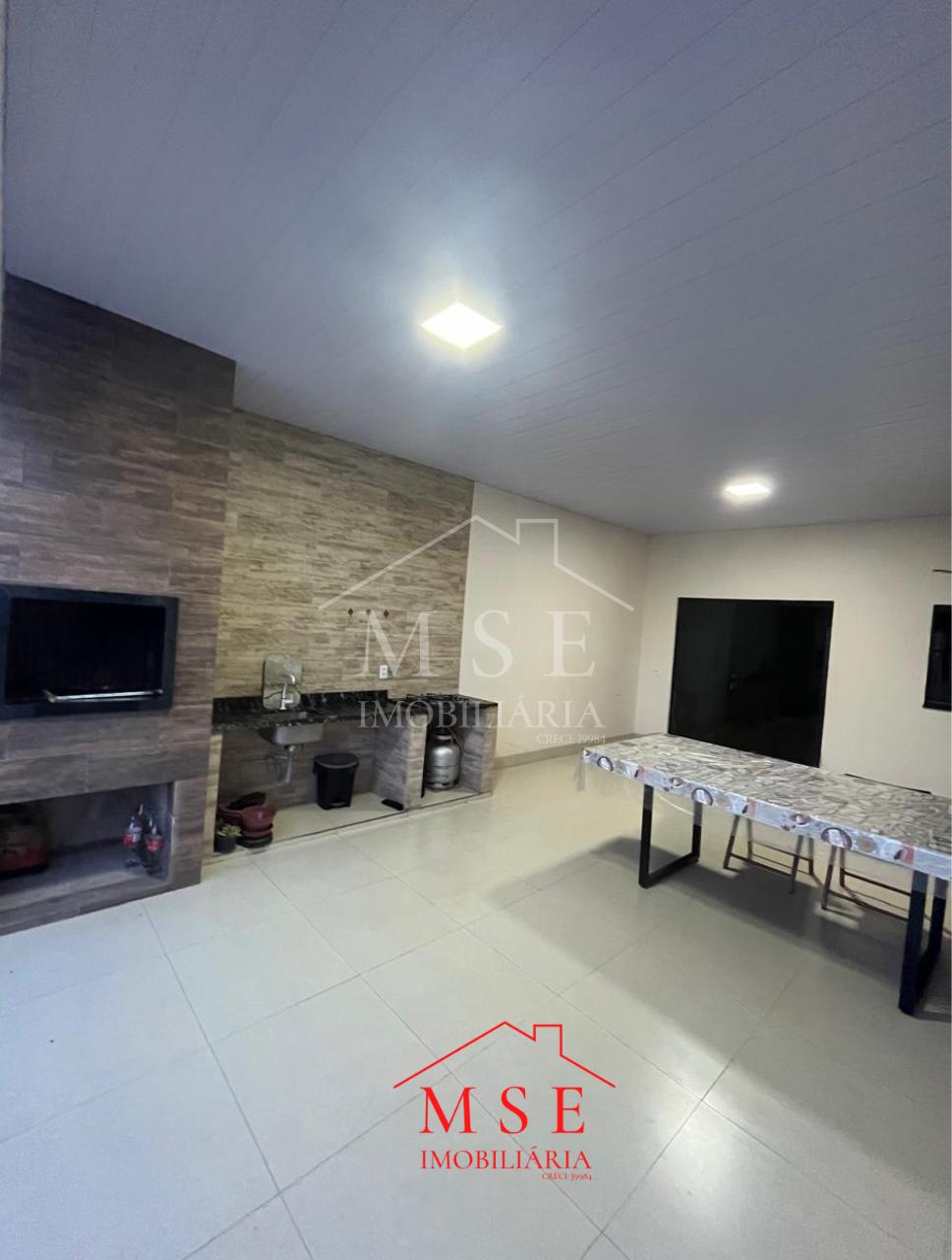 2 suítes, mais um quarto, 1 banheiro, sala, cozinha, área gourmet com churrasqueira, lavanderia fechada, quintal com piscina cascata chuveiro e espera pra aquecedor, estrutura metálica pra placa solar, garagem pra dois veículos (1 descoberto), alarme, cerca elétrica, portao eletrônico e instalação pra colocar interfone, forro em gesso, porcelanato.